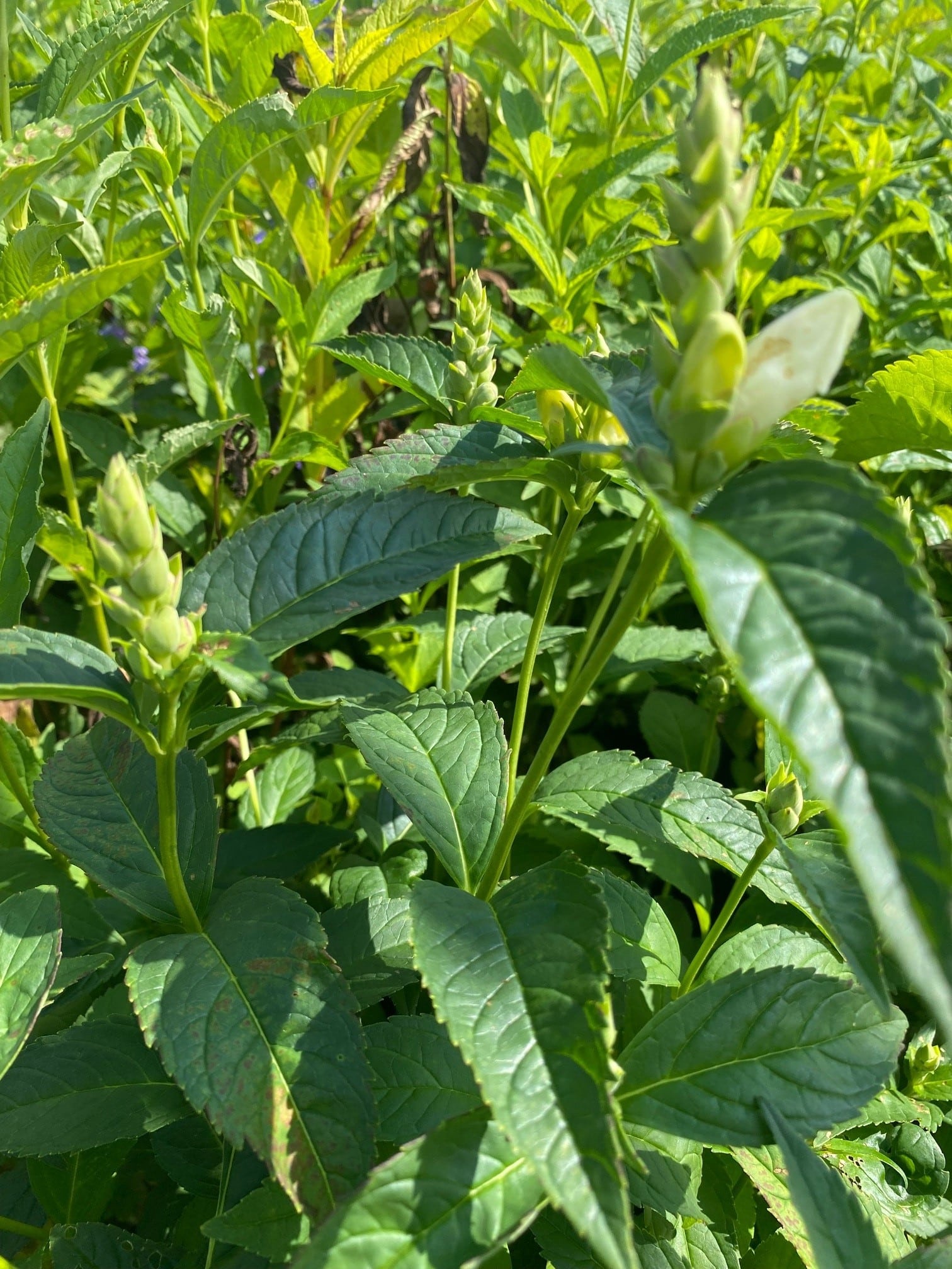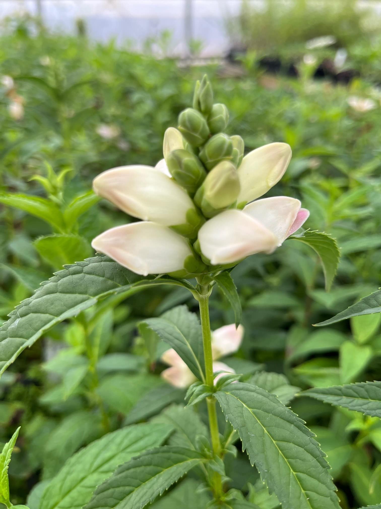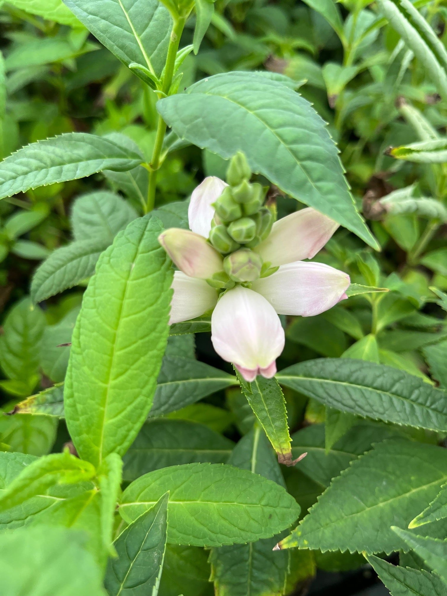 Chelone glabra, commonly called turtlehead, is a stiffly erect, clump-forming, leafy-stemmed perennial which typically grows 2-3′ tall and occurs in moist woods, swampy areas and along streams mostly in the southeastern part of the State. Hooded, snapdragon-like, two-lipped, white flowers with a tinge of pink appear in tight, spike-like terminal racemes from late summer into autumn. Flowers purportedly resemble turtle heads. Coarsely-toothed, lance-shaped, dark green leaves.