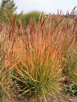 This showy perennial’s fall color is deep orange to purple. This is a beautiful grass with a somewhat metallic golden sheen to its flowering parts.